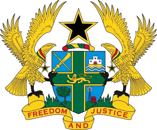 Azure, on a cross vert fimbriated or, a lion passant gardant or; in dexter chief, an asante sword and an oykeame staff or in saltire; in sinister chief, on a rock or emerging from a ocean barry wavy argent and azure, Osu Castle argent windowed and gated gules; in dexter base, on a hillock vert a cacao tree proper; in sinister base, on a hillock vert a gold mine proper. For a crest, on a wreath gules vert and or, a mullet of five points sable fimbriated or. For supporters, two tawny eagles or rousant with wings addorsed; about the neck of each, on a riband gules vert and or, a mullet of five points sable fimbriated or. For a motto, gules on a scroll or, Freedom and Justice.