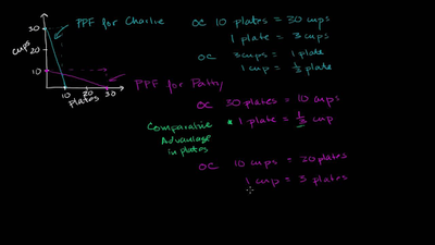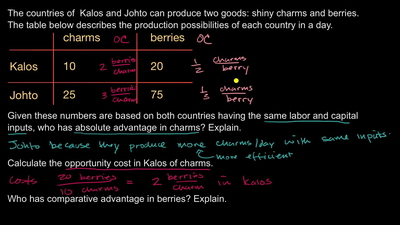 Comparative advantage is the ability to produce something at a lower opportunity cost than another economic agent. When economies specialize based on comparative advantage and trade, they can both benefit. Explore the concepts of comparative advantage, absolute advantage, and specialization.