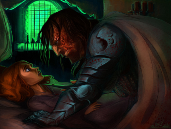 Sandor then asks that she sing for him, as she had promised she would. She is too frightened to remember the words of the song he wants, and can only sing the Mother's Hymn. After that, some instinct makes her cup his cheek with her fingers, and she can feel tears on his cheeks. Sandor strips off his white cloak and leaves her room.