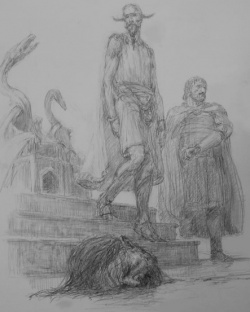 As the court is ended for further deliberation of the King's council, Ser Barristan decides to counsel the Dornishmen. Despite appearing weak, the King has taken notice of Quentyn, and Ser Barristan considers it dangerous for them to remain in Meereen. He advises them to return immediately to Dorne, going so far as offering the coin for the trip, and reveals that there was an attempt at poisoning either Daenerys or her consort during the fighting pits reopening.[1] Quentyn's shocked reaction reassures Ser Barristan that the Dornishmen had no part in the poisoning, but he still counsels Quentyn and his companions to leave Meereen and return to Dorne, for he considers his prospects of marriage unpromissing and his situation dangerous.
