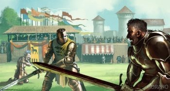 As they approach the king’s pavilion, they hear Robert raging at his squires, Tyrek and Lancel. When they enter the tent, Robert complains that his squires cannot even put a man’s armor on him properly, but Ned tells him the boys are not at fault—Robert is too fat for his armor. Robert tells Ned in mock anger that he should not call his king fat, and then sends the two squires off to get a breastplate stretcher from Ser Aron Santagar. After the squires run out, Robert and Ser Barristan laugh and even Ned smiles at the thought of the boys asking for the non-existent device.