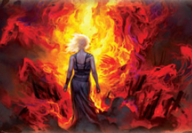 They wait for night to fall. It is Jhogo that first notices the red comet, the first star of the evening. Daenerys sees this as a sign to light the pyre. Mirri Maz Duur sings in a high, ululating voice at first, but her voice becomes a wail as the flames engulf her and she soon falls silent. The Dothraki and Ser Jorah back away as the smoke grows thicker and the heat stronger, but Daenerys stands her ground; she is the blood of the dragon and undeterred by the fire. She knew the truth long ago, but the brazier was not hot enough. Then Daenerys begins to slowly walk towards the fire as sweat covers her body. She sees many images as she walks: trees, animals, and a great grey stallion. Seeing the horse she tells Drogo to mount, and for a second she sees him mounted. He smiles at her and cracks a whip made of flame down upon the pyre and Daenerys hears the crack of breaking stone as the pyre collapses, showering her with ash, cinders, and broken egg shell. Behind her, she can hear the Dothraki and Ser Jorah shouting. As the pyre begins to collapse completely, Daenerys hears two more cracks like the first and walks into the heart of the fire.