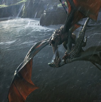 While Aemond was at Storm's End, Lord Borros received a visit from Prince Lucerys Velaryon, who had come to speak on behalf of Rhaenyra's claim. Aemond attempted to provoke Lucerys, who ignored his cousin. When Aemond threatened to kill Lucerys, Lord Borros refused to allow them to fight under his roof, and had his men stop Aemond. Once Lucerys had taken off on his dragon, Arrax, Lord Borros told Aemond "It is not for me to tell you what to do when you are not beneath my roof" and allowed him to leave. Aemond chased Lucerys on Vhagar. Aemond, mounted on Vhagar, avenged the loss of his eye when he managed to kill Lucerys and Arrax, which would have terrible consequences.[1][2][3][7] Ever since, Aemond is known as a kinslayer.[3]