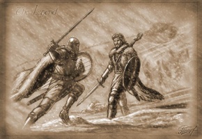 Bael the Bard, confronted by his son, Brandon's grandson. Art by Roman Papsuev. | |