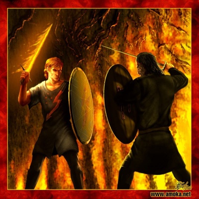 The captives are brought to Beric within the hollow hill, where he sits on weirwood roots and is revealed as a follower of the Lord of Light. They watch as Sandor Clegane duels Beric in a trial by battle. While Thoros of Myr always lit his blades with wildfire, Beric uses his own blood to make his sword magically aflame. Despite Sandor's fear of fire, he is able to slay Beric. Much to their surprise, however, Beric is revived by Thoros.[4]
