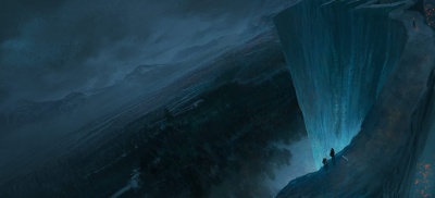 Tyrion Lannister and Jon Snow view the northern lands from atop the Wall.[22] Jon says his vows for the Night's Watch in a grove of weirwoods within the haunted forest.[7]
