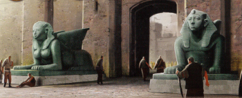 The Citadel lies on the Honeywine, where its towers and domes are connected with arching stone bridges. Houses and stalls sit on the bridges.[3] The gates are flanked by a pair of tall green sphinxes with the bodies of lions, the wings of eagles and the tails of serpents. One has the face of a man, the other a woman.[1]