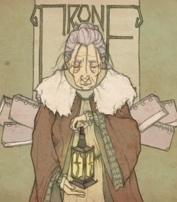 The pious dwarf makes Brienne of Tarth’s acquaintance at the Seven Swords inn common room. After chatting with her he notices Brienne looks sad and asks her if she is thinking of her missing sister, he pats her hand and tries to reassure her, telling Brienne “The Crone with light your way for her, never fear. The Maiden will keep her safe.”[3]