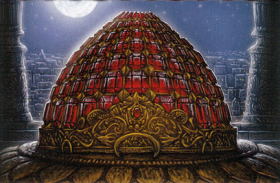 Crowns of the High SeptonDescription and History: The crowns of the High Septon of Faith of the Seven is an immense crown of spun gold and crystal that wreathed the head with rainbows when the wearer moves.[31][16][24] There have been two crowns in the course of A Song of Ice and Fire. The first went missing (and its wearer killed) during the Riot of King's Landing.[16] The second was a gift to the Faith and new High Septon from Tywin Lannister (the then Hand of the King) and much taller and more elaborate than the previous crown.[24] This second crown was sold by the faith, ostensibly to feed the hungry, when the next High Septon (known as the High Sparrow) assumed the position. This second crown is estimated (by Cersei) to add one and a half feet to the wearers height.[18] |