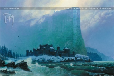 Eastwatch-by-the-Sea is the easternmost castle along the Wall, located on a grey, windswept shore by the Bay of Seals.[1] Near Eastwatch live some fisherfolk and to the west lies Greenguard.[2] Some wildlings trade with the Night's Watch at Eastwatch; wildlings prefer it to Castle Black, because trading ships from "the fabled lands beyond the sea" visit.[3]