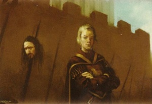 In response to his father's imprisonment for treason by Cersei, Robb Stark calls the northern banners to Winterfell and marches south.[63] For his part in Ned's downfall, Janos Slynt is named Lord of Harrenhal by King Joffrey.[64]