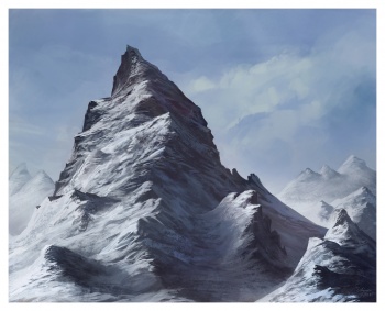 The Frostfangs are a cruel and inhospitable wilderness of stone and ice, blue-grey in color with snow-capped peaks.[3][4] However, the mountains conceal a diverse series of wonders. Icy waterfalls plunge over sheer stone cliffs, great lakes reflect snowy peaks, there are ravines so deep and black they seem to go all the way to hell, and bridges of natural stone span distances with only the sky to either side.[2]