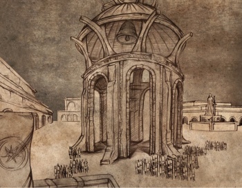 The sept is an impressive marble domed structure with seven crystal towers, each of which has bells. Only on momentous occasions, such as the death of a king, are all of them rung.[6] There are several sets of doors leading into the sept; septons use the Father's Doors, septas the Mother's Doors, and silent sisters the Stranger's Doors.[7] Around the doors leading into the building is a raised marble pulpit from which a septon can address a gathering crowd.[2]