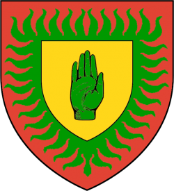 A green hand on a gold escutcheon on a green field, a border of red rayonne (Vert, on an escutcheon or a hand of the field all within a bordure rayonny gules) |