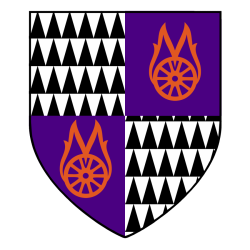 Quartered: black and white half-fusily, a wheel of flame on indigo (Quarterly, first and fourth half-fusily sable and argent, second and third purpure, a wheel inflamed proper) |