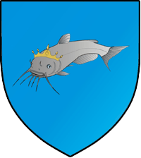 A crowned catfish, spotted grey, on a blue field (Azure, a catfish cendrée, crowned or) |