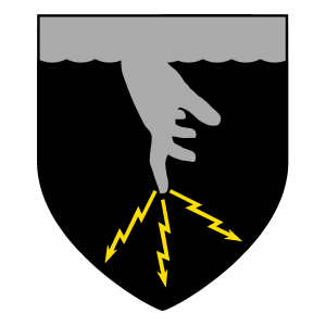 The storm god's cloudly hand, pale grey, yellow lightning flashing from the fingertips, on black (Sable, the storm god’s hand nebuly cendrée, issuant from its fingertips lightning bolts or) |