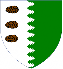 Per pale white and green, a fir tree line between, three brown pinecones on the white (Per pale sapiné argent and vert, in dexter three pinecones brunâtre) |