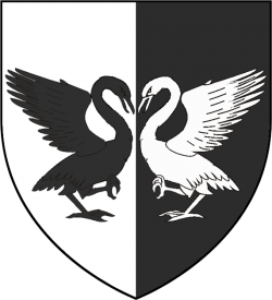 Battling swans black and white, beaks and feet golden, on per pale white and black field (Per pale argent and sable, two swans combatant counterchanged, beaked and membered or) |