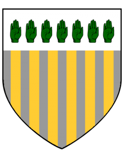 Oak and iron paly, beneath a white chief with seven green hands (Paly brunâtre and cendrée, on a chief argent seven hands vert) |