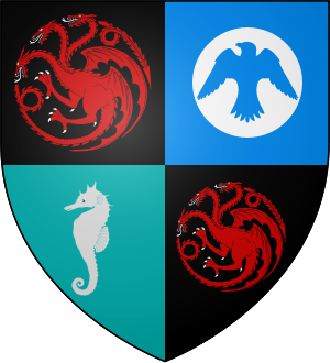 House Velaryon of Driftmark rules the island of Driftmark, the largest island of Blackwater Bay in the crownlands. Their castles include Driftmark and High Tide.[1] The head of House Velaryon is titled Lord of the Tides and Master of Driftmark.[2] The Velaryons are sworn to Dragonstone.[3] Their arms depict a silver seahorse on sea green.[4][5][N 1] Their words do not appear in the books, but according to semi-canon sources they are "The Old, the True, the Brave".[6] A traditional name of the Velaryons is Jacaerys.[7]