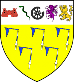Five splintered lances, 3, 2, striped blue and white with blue pennons, on a yellow field, beneath a white chief bearing a red castle, a green viper, a black broken wheel, a purple unicorn and a yellow lion (Or, five broken lances, 3, 2, striped azure and argent, pennons of the second, on a chief of the third, a wheel broken sable between, on the dexter, a castle gules and snake vert, and, on the sinister, a unicorn rampant purpure and lion rampant of the field) |