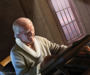 A tireless maester,[2] Luwin is a small grey man with grey eyes and thinning hair.[3][4] He has a robe of grey wool with voluminous sleeves. In the sleeves are sewn pockets, from which Luwin is always drawing things.[3] His maester's collar is a simple choker,[5] and he often tugs at the chain around his neck when he is uncomfortable.[4] His turret at Winterfell is always so cluttered that it seems to Bran Stark a wonder that Luwin ever finds anything. He owns a bronze far-eye from Myr.[6]