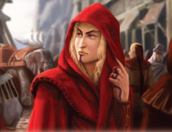 Lysono is a Lyseni, with pale lilac eyes and long white-gold hair.[1][2] His lips are very full, giving him an almost feminine appearance at first glance. His fingernails are painted purple, and his earlobes drip with pearls and amethysts.[1] Lysono is glib but guarded in conversation.[2]