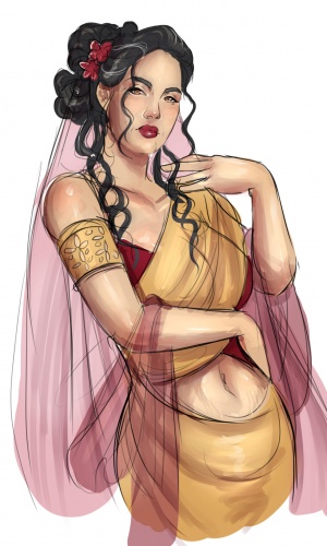 Mellario was born in Norvos.[2] Accompanied by her guardsman, Areo Hotah, she met Prince Doran Martell when he was visiting the city of her birth. Doran caught her eye during a festival, where the three bells of Norvos were ringing and the bears were dancing.[5] When Doran returned to Dorne, Mellario went with him, escorted by Areo Hotah.[6] By 273 ᴀᴄ, Doran and Mellario were betrothed.[7] They would marry not long after, as their first child, Princess Arianne was born in 276 ᴀᴄ.[8] Two more children would follow: Prince Quentyn, born in 281 ᴀᴄ,[9] and Prince Trystane, born in 287 ᴀᴄ.[10]