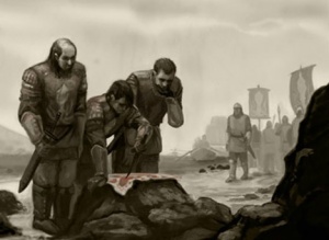 King Robert I Baratheon ponders abdicating the Iron Throne and fighting as a sellsword.[36]