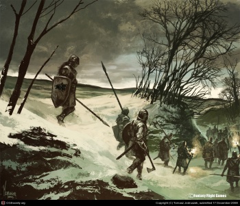 Rather than attacking the Dreadfort, Stannis Baratheon is convinced by Jon Snow, Lord Commander of the Night's Watch, to travel west from Castle Black to the northern mountains. The mountain clans field him three and a half thousand men,[N 2] and Stannis liberates Deepwood Moote for the Glovers.[3] The king marches through the wolfswood to take Winterfell from Roose. Stannis's march on Winterfell is slowed, however, by strong blizzards[69] which also hamper Roose.[70]