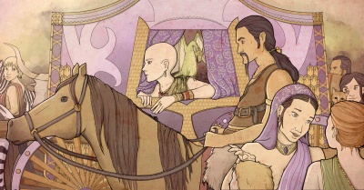 The Qartheen ride camels.[5][16] The riders wear scaled copper armor and snouted helms with copper tusks and long black silk plumes. They sit high on saddles inlaid with rubies and garnets. Their camels are dressed in blankets of a hundred different hues.[5]