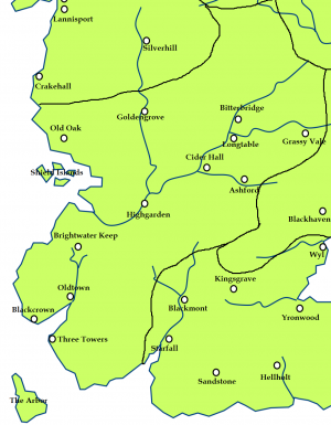 The Reach is watered by the immense river Mander and its tributaries, including the Blueburn and the Cockleswhent. The Reach proper is centered around the Mander.[5] Oldtown is located at the mouth of the Honeywine. The region also includes several islands, including the Shield Islands near the mouth of the Mander and the Arbor south of the Whispering Sound and the Redwyne Straits.