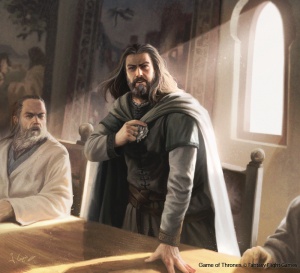 King Robert I Baratheon claimed the Iron Throne after the death of King Aerys II Targaryen. Ser Aron Santagar serves as master-at-arms of the Red Keep, while Ser Ilyn Payne is the King's Justice.[57] Grand Maester Pycelle handles the castle's ravens.[25] Moon Boy and Orland are Robert's fool and bard, respectively.[58]