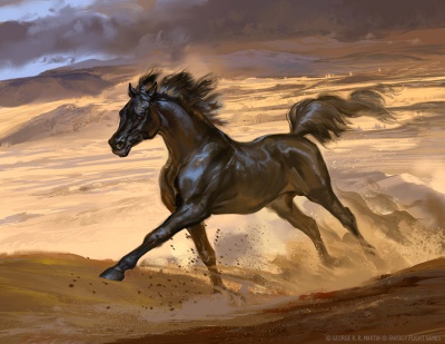 Prince Oberyn Martell is riding a stallion black as sin with a mane and tail the colour of fire when arriving in King's Landing.[1]