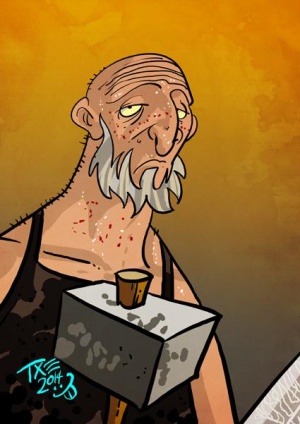 Tobho is stubborn and loyal to his staff. He owns a black velvet coat which has silver hammers embroidered on the sleeves. A large sapphire hangs on a heavy silver chain about his neck.[1]