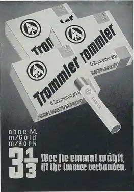 In early advertisements, all four main brands were listed; Nazi party imagery and the political slogan "Gegen Trust und Konzern" ("Against the [corporate] trust and the combine") were used. Later marketing focused on the "Trommler" brand. Apart from print advertising, the company owned a sound truck and hired advertising planes.[3] Cigarette marketing reflected the political and economic situation. For instance, in 1930–1932, during the economic crash, advertisements showing catastrophic situations were common.[3]