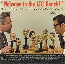 "Welcome to the LBJ Ranch!" is a political satire comedy album by Earle Doud and Alen Robin, released in November 1965 on Capitol Records. The vinyl album uses out-of-context recordings of political figures apparently responding to interview questions fabricated by the comedians. Television comedy writers Earle Doud and Alen Robin conduct some of the "interviews"; other interviewers are news announcers John Cameron Swayze and Westbrook Van Voorhis, with WPIX anchorman John St. Leger, all of whom were recorded speaking questions written by Doud and Robin. Audio tape was edited to bring together the comedy questions and the recordings of political people, with laugh track sound effects added by Bob Prescott.