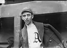 Barry was the next to join the Athletics, debuting on July 13, 1908, after playing for the College of the Holy Cross.[9][10] Between 1910 and 1914, Barry played 686 games for the Athletics, getting 607 hits in 2,334 at bats for a batting average of .260.[9] He finished in the American League top ten in sacrifice hits every year from 1911 through 1914, and ranked fifth in the American League in runs batted in in 1913.[9] But his primary contributions were on defense, where he had a strong arm, enormous range and sure hands, and was able to work out innovative plays with his good friend Collins, such as a defense against the double steal.[10] He finished in the top 20 in Most Valuable Player voting every year from 1911 through 1914, with his best showing a ninth-place finish in 1913.[9] He was sold to the Boston Red Sox in the middle of the 1915 season, where he moved to second base and played on the Red Sox' 1915 and 1916 World Championship teams.[11][12] He missed the Red Sox 1918 Championship season due to service in the U.S. Navy.[10]