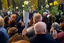 When the security forces violently disbanded a peaceful demonstration in Budapest on 16 June 1988, the 30th anniversary of Nagy's execution, Árpád Göncz, as Vice Chairman of the Historical Justice Committee, wrote a letter to General Secretary and Prime Minister Károly Grósz, Kádár's successor to protest against the police action and called on the regime to face its past.[52] In a response letter, Grósz rejected the implementation of demanded political reforms.[53] Finally (due to the appointment of the reformist Miklós Németh as Prime Minister in November 1988) the reburial took place in the next year on 16 June, Göncz took part in organizing, as he proposed, there was a fifth empty coffin beside the four martyrs' for the anonymous heroes and freedom fighters of the revolution. Göncz was the one who officially opened the ceremony.[54]