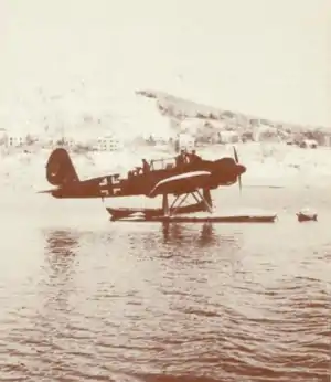 Luftwaffe started looking for a site for an airport between Bergen and Trondheim in January 1941. At first they suggested Spjelkavik, but this was changed and Aukra Airport, Gossen built instead. However, the Luftwaffe still needed a base for seaplanes to operate near Ålesund.[10] For this they carried out the plans which the Naval Air Service had made and erected a seaplane base later in 1941.[6] This was at first built at Nørvevika, but was later relocated slightly to Sørneset. The ships were anchored to a buoy and a barracks was built on land.[11] It was manned with two Arado Ar 196 of 2. Kustenfliegergruppe 406. One of these crashed on 18 March 1943 at Rambjøra in Haram, killing both on board.[12] The second crashed at Volsdalen in Ålesund on 18 October.[13]