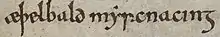 By 731, Æthelbald had all the English south of the Humber under his overlordship.[14] There is little direct evidence of the relationship between Æthelbald and the kings who were dependent on him.[6] Generally, a king subject to an overlord such as Æthelbald would still be regarded as a king, but would have his independence curtailed in some respects. Charters are an important source of evidence for this relationship; these were documents which granted land to followers or to churchmen, and were witnessed by the kings who had power to grant the land.[15][16] A charter granting land in the territory of one of the subject kings might record the names of the king as well as the overlord on the witness list appended to the grant; such a witness list can be seen on the Ismere Diploma, for example. The titles given to the kings on these charters could also be revealing: a king might be described as a "subregulus", or underking.[17]