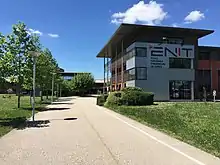 In Tarbes, ENIT is located in the southwest, in the Tarbes-Pyrenees university center that includes several schools, laboratories, university residence and a cafeteria. The school and campus are served by T2 bus line at University stop and by T3 bus line at ENI stop. The lines also connect the city center (Verdun place) and the railway station.[3][4]