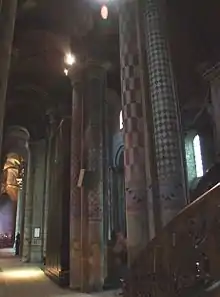 The Romanesque frescoes do not survive apart from those in the apse vault above the choir and in the crypt. Above the choir one can see an uncommon portrayal of the apocalypse: the Virgin and Child are shown in a mandorla, Christ is in majesty on the vault, between a circle and a square, then the Lamb of God is shown in a circle. All around, under the arches are the Twelve Apostles seated, as on the facade. Historians of art think that this painting served as a model for the sculptures on the facade, the attitudes and the composition being identical. In the angles, angels accompany souls to paradise. In the crypt, the frescoes show anonymous saints. The whole ensemble was restored by Joly-Leterme in 1851. He had the columns and the vaults repainted with "Romano-byzantine" motifs, departing from a principle current among the restorers of the 19th century, that of the influence of the Crusades on Romanesque art. Fantastical and rather heavy, these paintings have been criticised since then. The writer Joris-Karl Huysmans called them "tattoos".