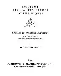 - Grothendieck, Alexandre; Dieudonné, Jean (1960). "Éléments de géométrie algébrique: I. Le langage des schémas". Publications Mathématiques de l'IHÉS. 4: 5–228. doi:10.1007/bf02684778. MR 0217083.[2]