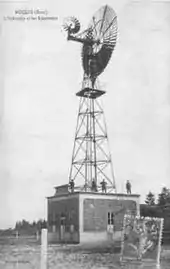 The Clarkson wind engine consisted of a rotor or a number of rotors, one behind the other, revolving in a casing with fixed guide vanes between and of opposite pitch to those of the rotors, and having a further casing to admit a fresh supply of wind to the rotors behind. The cylindrical casings are open at each end with a larger opening facing the wind. The wind catches a number of wheels and feathered vanes fixed to a shaft revolving in bearings inside the casings. When the wind has passed between the vanes of the front wheel it is directed by the guide vanes to the second wheel and is again taken up by guides and passed to a third wheel and so on, the action each time increasing the effect of the wind on the shaft and improving efficiency. The Clarkson of which an illustration survives (1919) was erected by the Air Power Co. of Prestwich, Cheshire on the estate of Lord Derby. This small engine was designed to work in a 12-mile-per-hour (19 km/h) wind, but could start under load in a wind of only 7 miles per hour (11 km/h). The wind wheel was only 5 feet (1.52 m) diameter and is designed to lift 100 imperial gallons (450 L; 120 US gal) of water per hour to a height of 50 feet (15.24 m) in a 12-mile-per-hour (19 km/h) wind, or double that quantity in a 15-mile-per-hour (24 km/h) wind. All the Air Power wind engines were fitted with roller bearings, a starting and stopping arrangement and an automatic gear to cut off all wind above any desired velocity. They were mounted on a strong steel tower, with a ladder and circular platform.[7]