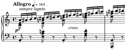 Étude Op. 10, No. 2, in A minor, is a technical study composed by Frédéric Chopin for the piano. It was preceded by a relative major key. Composed in November 1829,[1] it was first published in 1833 in France,[2] Germany,[3] and England.[4] This étude is an exercise in developing the independence of the weaker fingers of the right hand by playing rapid chromatic scale figures with the third, fourth, and fifth fingers of the right hand. Meanwhile, the first two fingers of the right and the left hand play an accompaniment of short intervals and single notes. Chopin indicated the fingering himself note by note for almost 800 notes.[5]
