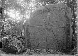 The runic text on Ög 77 states that the stone was raised by a woman named either Tunna or Tonna in memory of her husband Þorfastr, who is described using the word óníðingr. Óníðingr, which with the ó- prefix means the opposite of the Old Norse pejorative word níðingr, was used to describe a man as being virtuous. Óníðingr is used as a descriptive word in some runic inscriptions and is translated in the Rundata database as "unvillainous." It is used as a descriptive term on inscriptions Sö 189 in Åkerby, Sm 5 in Transjö, Sm 37 in Rörbro, Sm 147 in Vasta Ed, and DR 68 in Århus, and appears as a name or part of a name on inscriptions Ög 217 in Oppeby, Sm 2 in Aringsås, and Sm 131 in Hjortholmen.[2] The text on Ög 77, Sm 5, and Sm 37 use the same exact phrase, manna mæstr oniðingʀ or "most unvillainous of men" to describe the deceased,[2] and DR 68 uses a variant of this phrase.[3]