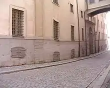 The northern end of Österlånggatan forms a discreet and informal back door to the old town; recessed in a corner of the prestigious Slottsbacken it can be hard to even discover, and as the narrow northern end is squeezed between tall façades, it is easy to misinterpret the street as yet another of the many alleys. The first block is, however, flanked by two buildings worth a brief note: On the right side is the rear face of the Royal Coin Cabinet, housing a royal collection begun in the 16th century, and on the left is Number 1, a building started in 1897 and completed in 1950 to the plans of Ivar Tengbom (1878–1968), more famous as the architect behind Stockholm School of Economics and Stockholm Concert Hall – the windows facing Telegrafgränd, the first alley, gives a clear idea of what the building looked like at the time, in sharp contrast to the 18th-century stone portal on the opposite side of the alley.[3][4]