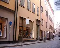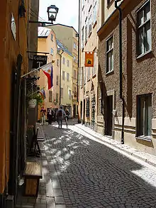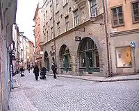 Like Västerlånggatan, Österlånggatan used to pass outside of the city walls and was for many centuries one of the city's major streets. (See Västerlånggatan for more details.) When Skeppsbron, the broad street and quay running to the east of Österlånggatan, was created during the 17th century, Österlånggatan lost much of the importance it used to have.[1] Compared to Västerlånggatan, Österlånggatan is today a relatively quiet street notwithstanding the many restaurants and shops, in sharp contrast to the neighbourhood when the street formed the backyard of the dock district, crowded with sailors, taverns, travellers, and traders.[2]